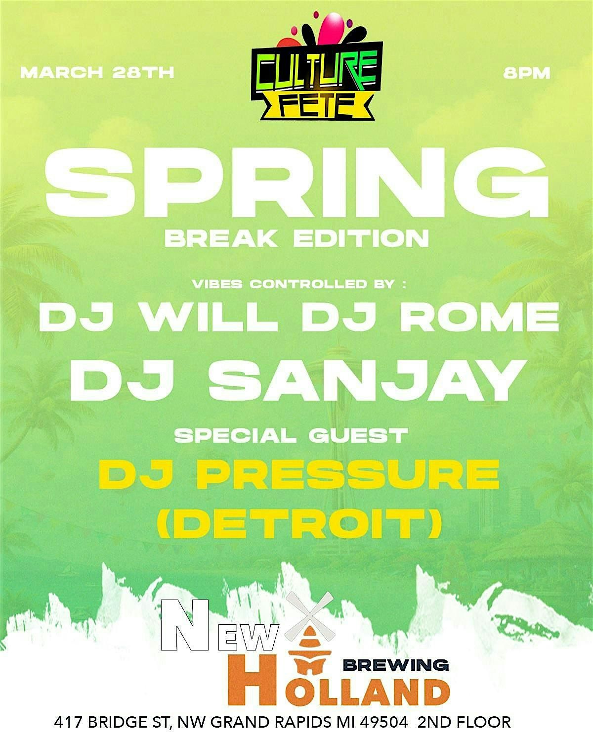 Get ready for a fun night at New Holland Brewing - Grand Rapids Brewpub (The Knickerbocker)! Join us on March 28, 2026 at 8:00 PM ( for an energetic spring break celebration filled with great vibes, curated cocktails, and community. Whether you're here to chill or dance, this is the place to be. Don't miss out on the good times and good people