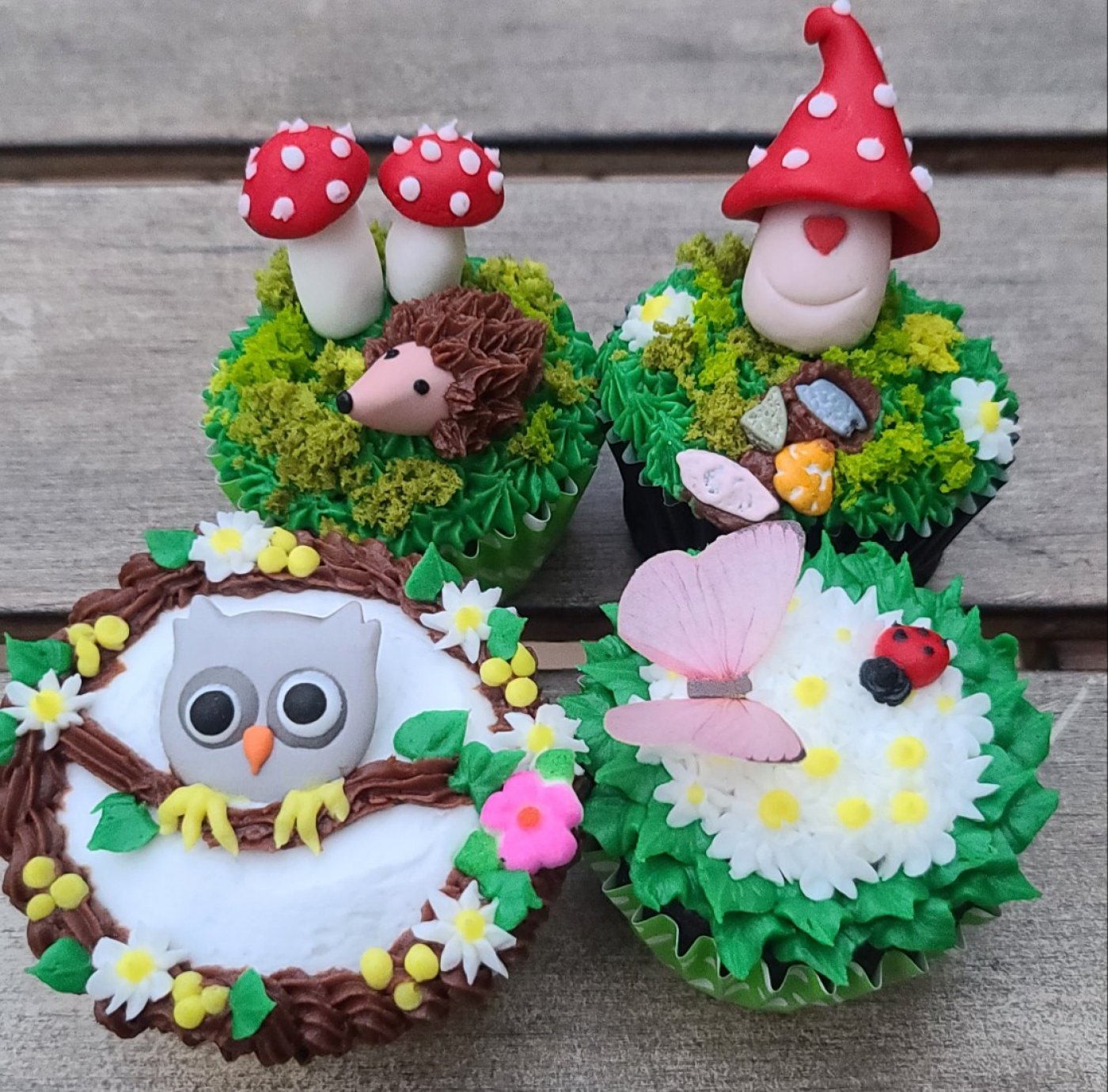 You will be supplied with 2 vanilla and 2 chocolate cupcakes with a carrying box. We will practice some piping skills first before decorating the cupcakes. A little bit of fondant will also be used to create the mushrooms, hedgehog, and ladybug. The owl is a premade royal Icing decoration.
