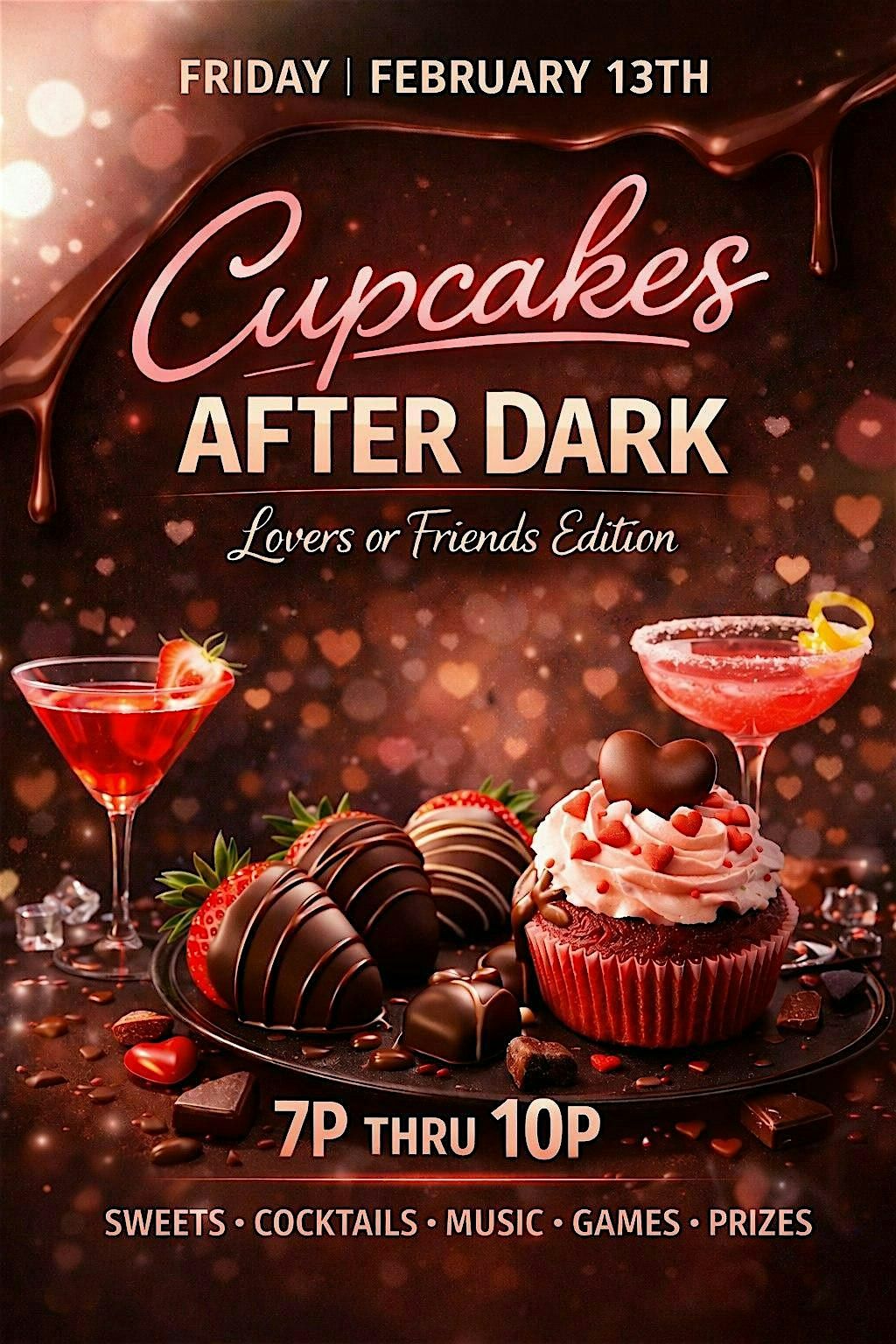 Cupcakes After Dark: Lovers or Friends Edition is an elevated, after-hours experience designed for connection, celebration, and playful indulgence. Join us Friday, February 13th from 7–10 PM, for this special Valentine’s-inspired evening; where you can unwind in a chic, intimate atmosphere filled with music, laughter, and sweet surprises.