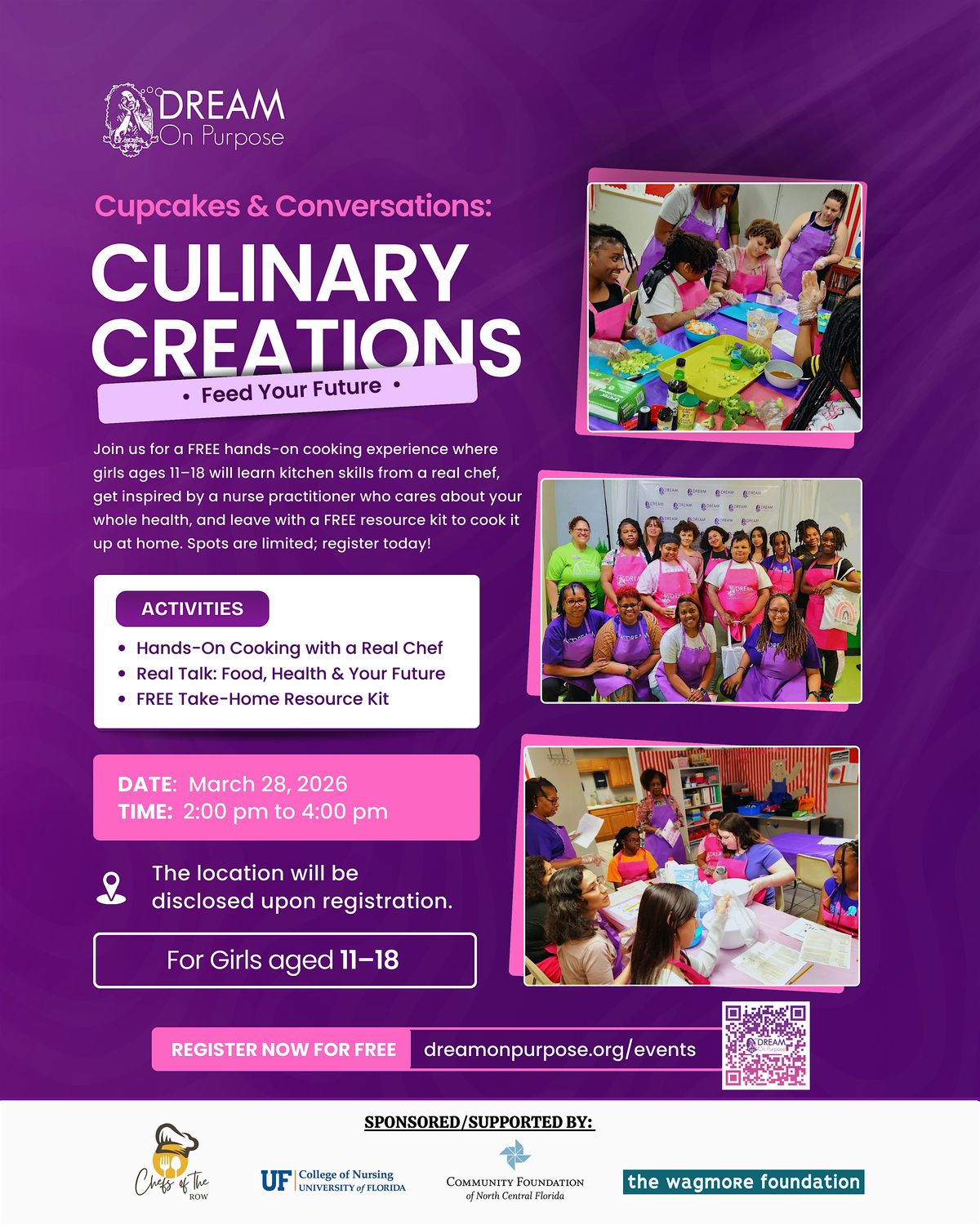 Join Dream on Purpose at Cupcakes & Conversations: Culinary Creations, which takes place on March 28, 2026, from 2pm to 4pm in Gainesville, FL for a FREE hands-on cooking experience where girls will learn kitchen skills from a real chef, get inspired by a nurse practitioner who cares about your whole health and leave with a FREE resource kit to cook it up at home. There will be fun activities, engaging conversations, resource kits, cool prizes, and, of course, cupcakes!
