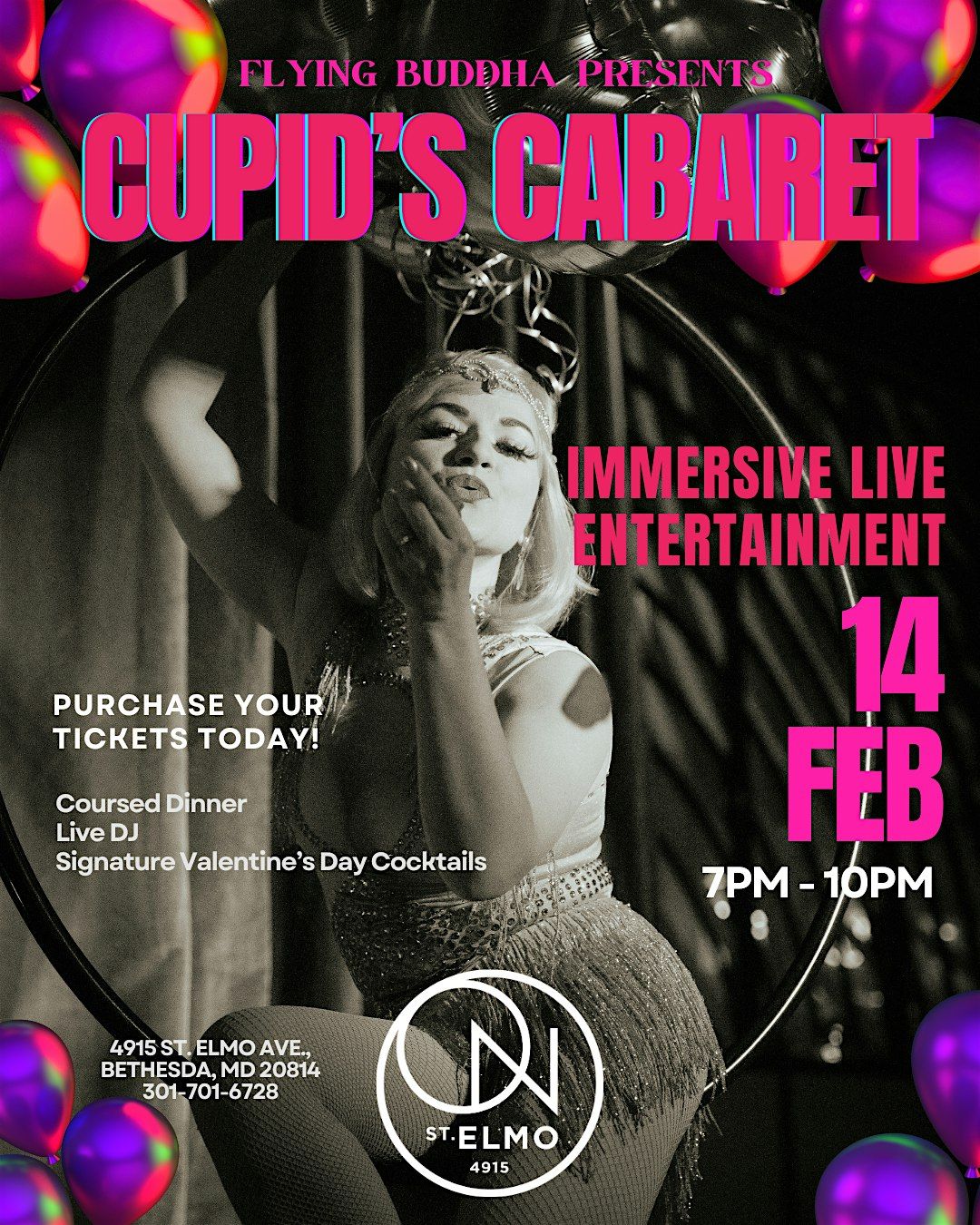 This Valentine's Day, step into a world of romance, and intrigue, with a touch of mischief at Cupid's Cabaret. The evening begins playfully with a cocktail hour accompanied by live, interactive entertainment and passed hors d'oeuvres. Every performance is designed to delight and surprise, ensuring your senses are fully engaged through the evening. As the evening continues with a 3 course dinner accompanied by cirque inspired performances creatively curated to awaken all your senses. The Cupid's Cabaret dinner experience will go til 10pm and ON lounge will start at 10pm for dancing.