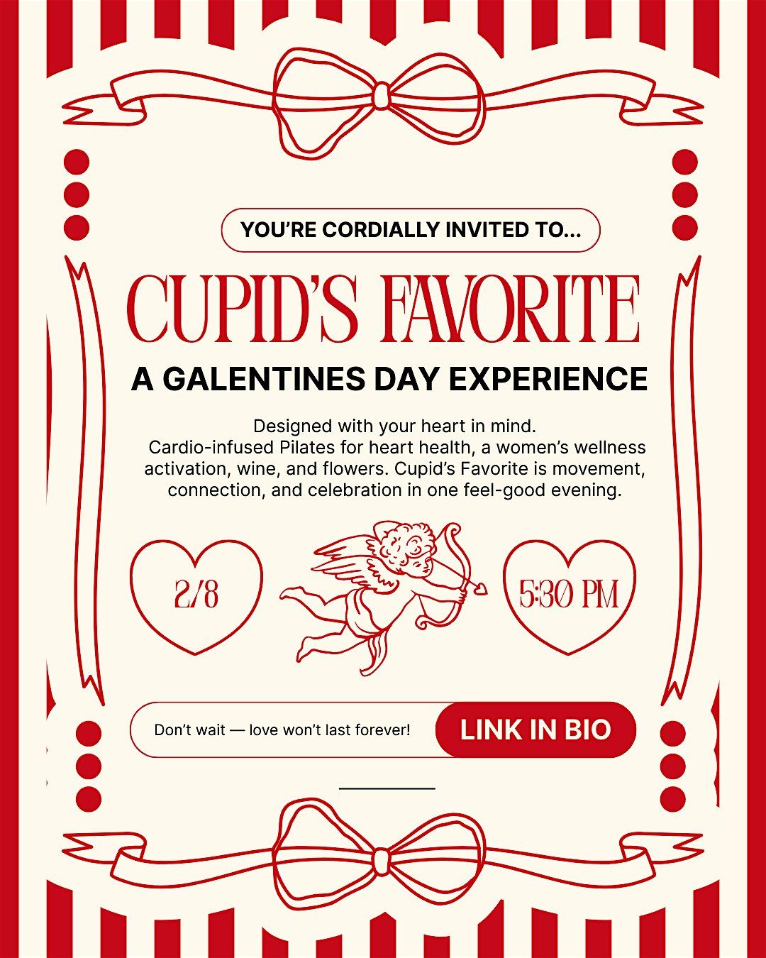 Cupid’s Favorite brings women together to move, learn, and celebrate themselves. Enjoy a heart-pumping mat Pilates class, engage in a women’s health activation, sip a glass of wine, and purchase fresh bouquets to take home. It’s Galentine’s reimagined with intention, joy, and heart health at the center. Please come in shades of Pink, Red, or White!