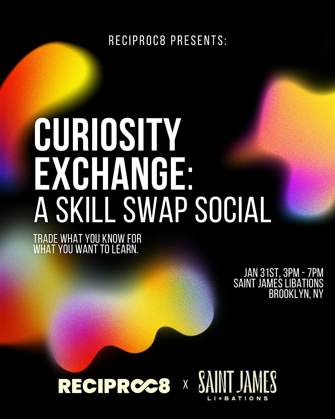 Join Reciproc8 at Saint James' Libations for a FREE afternoon of skill swapping, activities focused on connection, and good conversation paired with good wine. Meet people who want to trade what they know for what you know, whether that's design for Spanish lessons, resume help for fitness coaching, or something you haven't thought of yet.