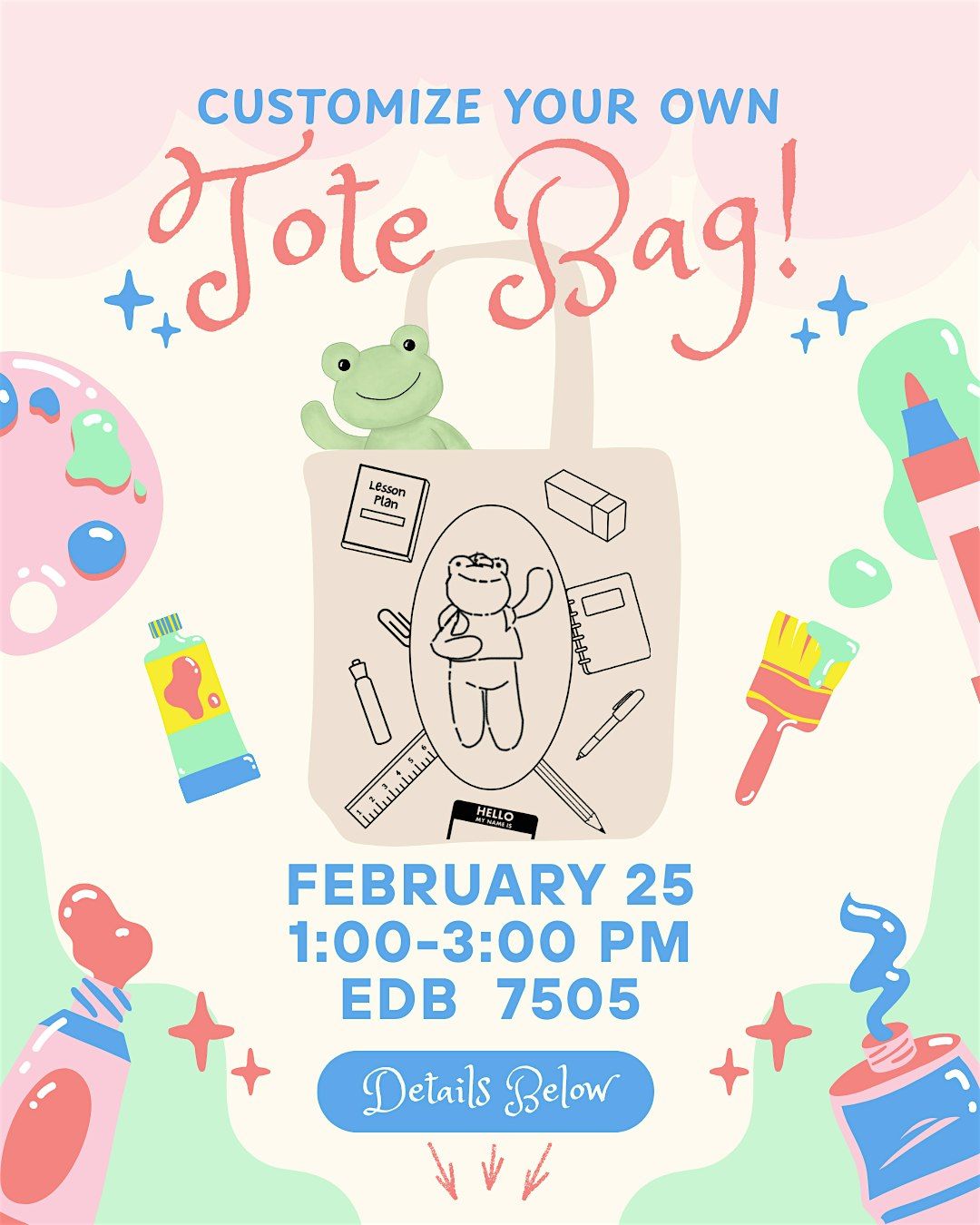 Customize your own Frogbert tote bag with ESA at our Tote Bag Colouring Event on February 25, 1:00PM-3:00PM (EDB 7505)!
