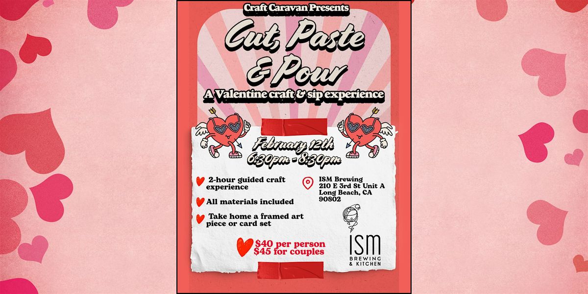 Welcome to Cut, Paste & Pour - a Valentine craft and sip experience at ISM Brewing & Kitchen! Join us on February 12, 2026 at 6:30 PM for a fun-filled evening of creativity and relaxation. Let your artistic side shine as you create unique crafts while enjoying delicious drinks.