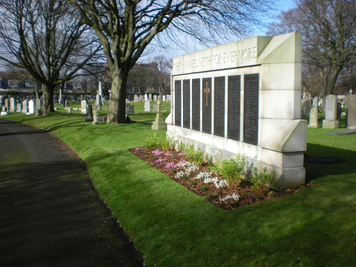 Seafield Cemetery contains 185 First World War burials, some Canadian graves and one Australian grave in the military plot in Section B, others in the admiralty plot in Section M (marked by a screen wall bearing the names of those buried there or unmarked in other parts of the cemetery), the rest scattered. There are also 104 Second World War burials in the cemetery, most of them forming a plot in Section P, five of these are unidentified seamen. The Admiralty Plot includes men from H.M.S. Cossack, H.M.S. Saucy and B.V. 42 which blew up in Leith Docks on 22nd December 1943. There are also two war graves of other nationalities and three non-war service burials. Family headstones commemorate civilians killed in bombing raids in Leith in 1940. Seafield Crematorium stands within the cemetery and 21 servicemen and women of the Second World War whose remains were cremated there are commemorated on a screen wall opposite the war graves plot in Section P.