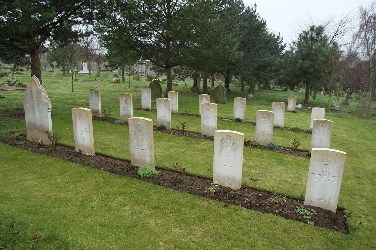 The cemetery contains war graves of both World Wars. During the early months of the 1939-1945 War ground was set aside by the local authorities about 40 yards north of the 1914-1918 plot for service war graves. This was not generally used, and the majority of the graves are in various parts of the cemetery, in positions chosen by those responsible for the interments. One sailor and one Merchant Navy seaman are not identified.