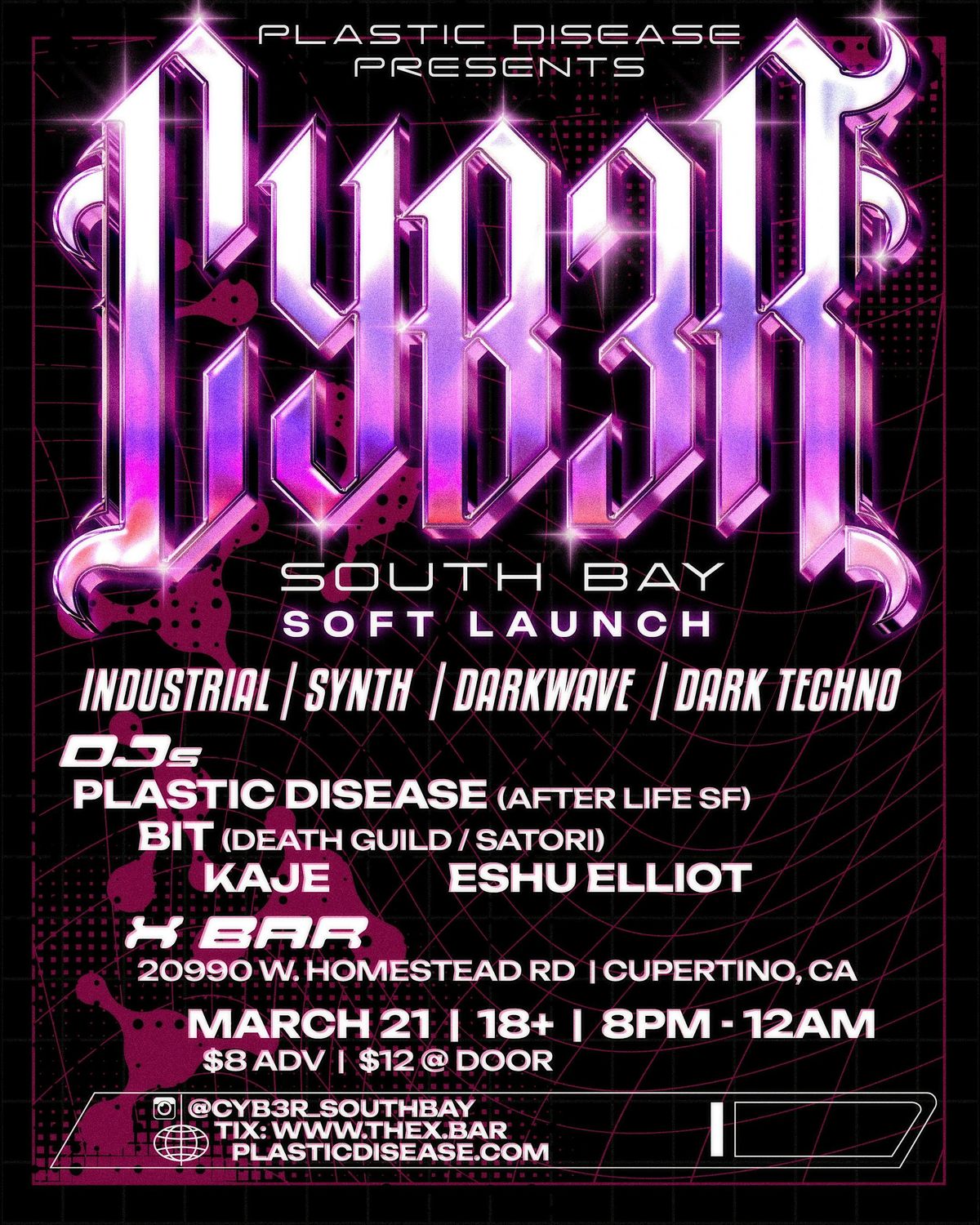 CYB3R is a dark electronic music night presented by Plastic Disease, launching in the South Bay with a focus on industrial, synth, darkwave, and dark techno.