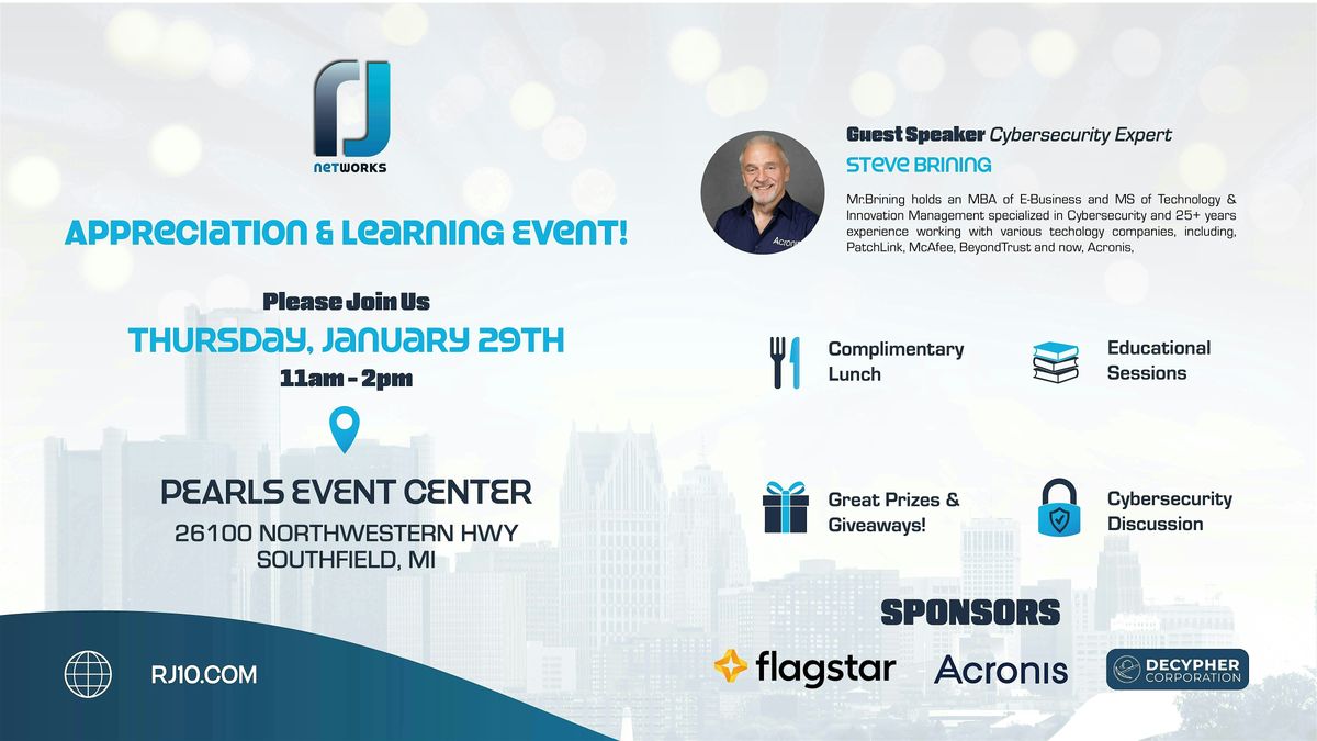 Join us on January 29th from 11 AMβ2 PM at Pearls Event Center for the RJ Networks Appreciation and Learning Event. Enjoy lunch, giveaways, and valuable cybersecurity awareness discussions while connecting with our team and local organizations. Register today to reserve your spot!