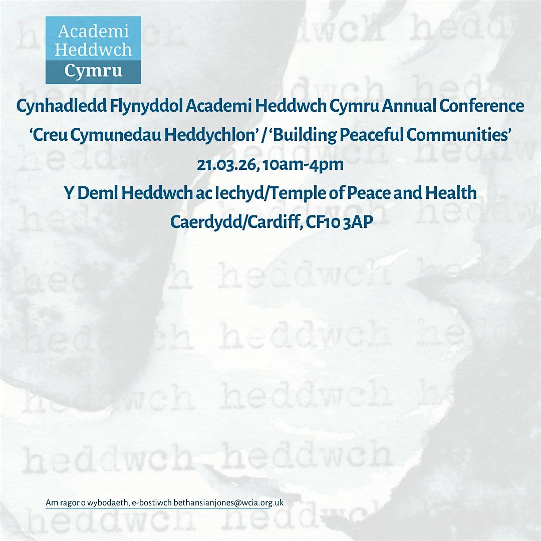 Mae Academi Heddwch Cymru (sefydliad heddwch cenedlaethol Cymru) yn eich gwahodd i gymryd rhan yn ei chynhadledd undydd: ‘Creu Cymunedau Heddychlon’.