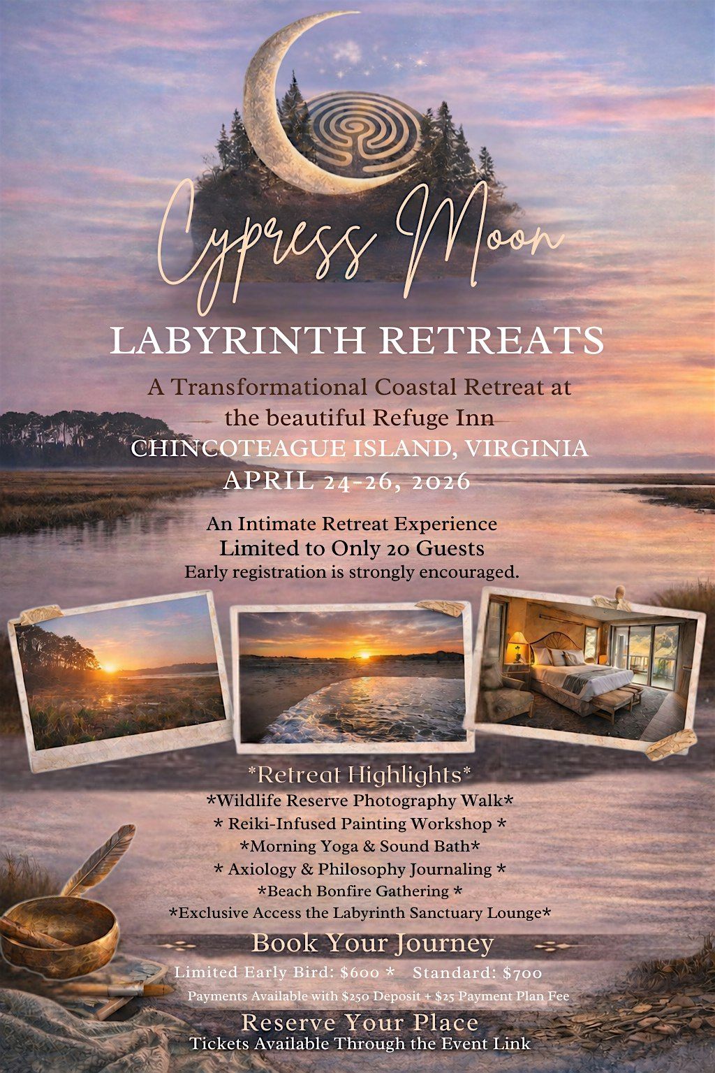 Join us for the Cypress Moon Labyrinth Retreat, an intimate coastal gathering designed to reconnect you with creativity, reflection, and renewal in one of the most peaceful natural settings on the East Coast.
