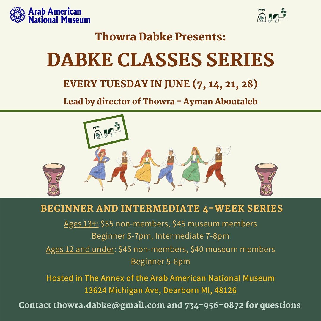 Check out the dabke classes every Tuesday starting June 7th. Adding new intermediate classes! Completion of the beginner classes is required to sign up. Stay tuned for the advanced level being added next month (intended for those wanting to lead a line or join any dabke team). Classes are held in person at the Arab American Museum. For kids ages 12 and under beginner class is at 5pm. For ages 13+ the beginner class is at 6pm and the intermediate is at 7pm. In the beginner series you will learn the proper technique and a lot of the fundamentals and a few variations. In the intermediate series you learn the rest of the fundamentals and more complex moves. All classes and levels will build on each other.