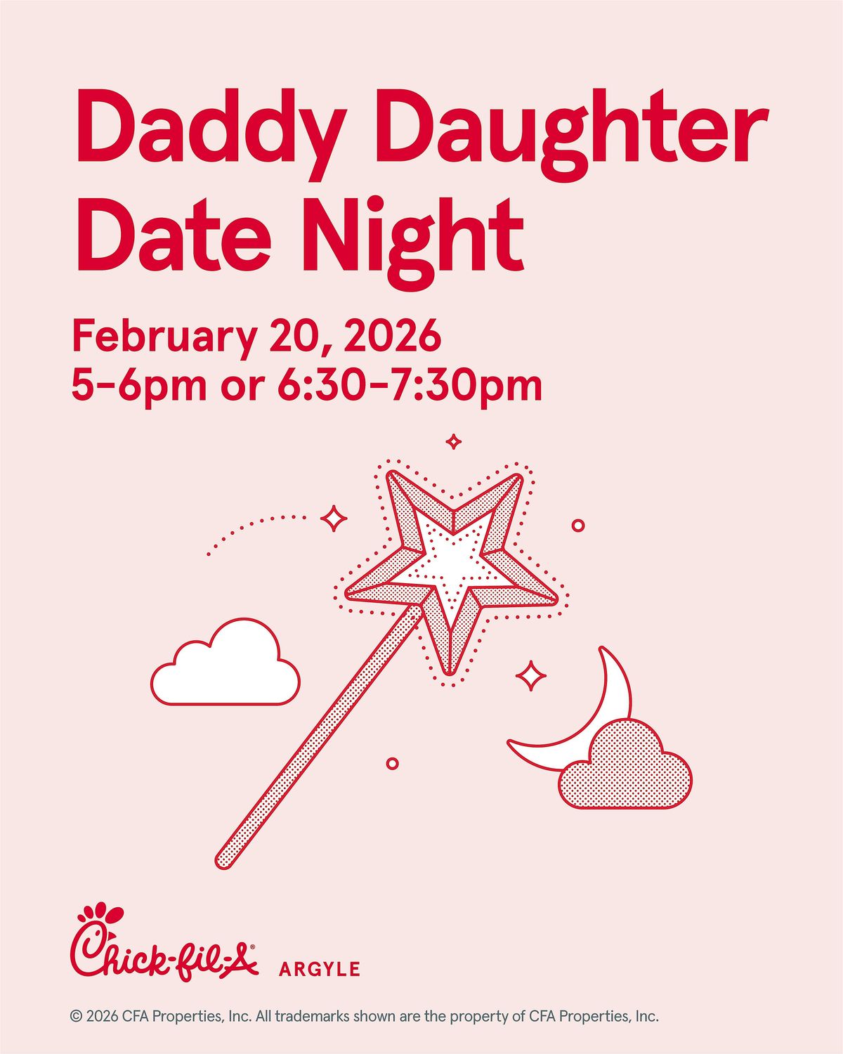 Come join us for a special evening of fun and bonding at Chick-fil-A Argyle! Treat your daughter to a night she'll always remember with dinner, activities, and quality time together. This is your chance to show her how much she means to you and create lasting memories. Don't miss out on this opportunity to strengthen your father-daughter relationship and have a blast while doing it. We can't wait to see you there!