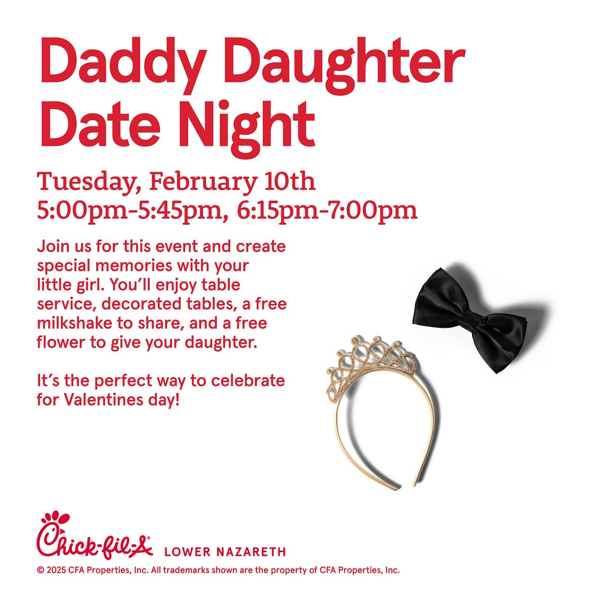 Daddy Daughter Date Night! Enjoy table service, and a great night with your daughter. We will be providing a flower for Daddy to give to their daughter. Sign ups are required and we hope to see you here while we turn Chick-fil-A into the perfect date night. 1 Ticket = 1 Table for the Daddy & Daughter(s), please list names on the required questions.
