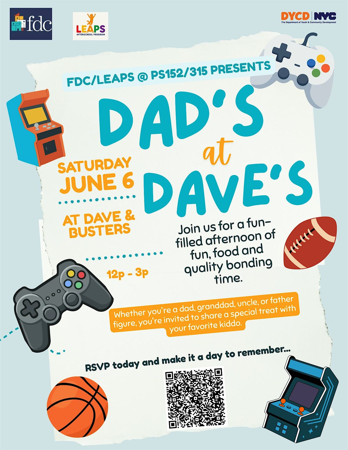 Join us for a fun filled afternoon at Dave & Buster's ! This is an in-person event where we celebrate all the amazing dads out there. Enjoy delicious food, great company, and a warm, welcoming atmosphere.We would like to honor and celebrate the important role of fathers and father figures, this event is reserved just for them.