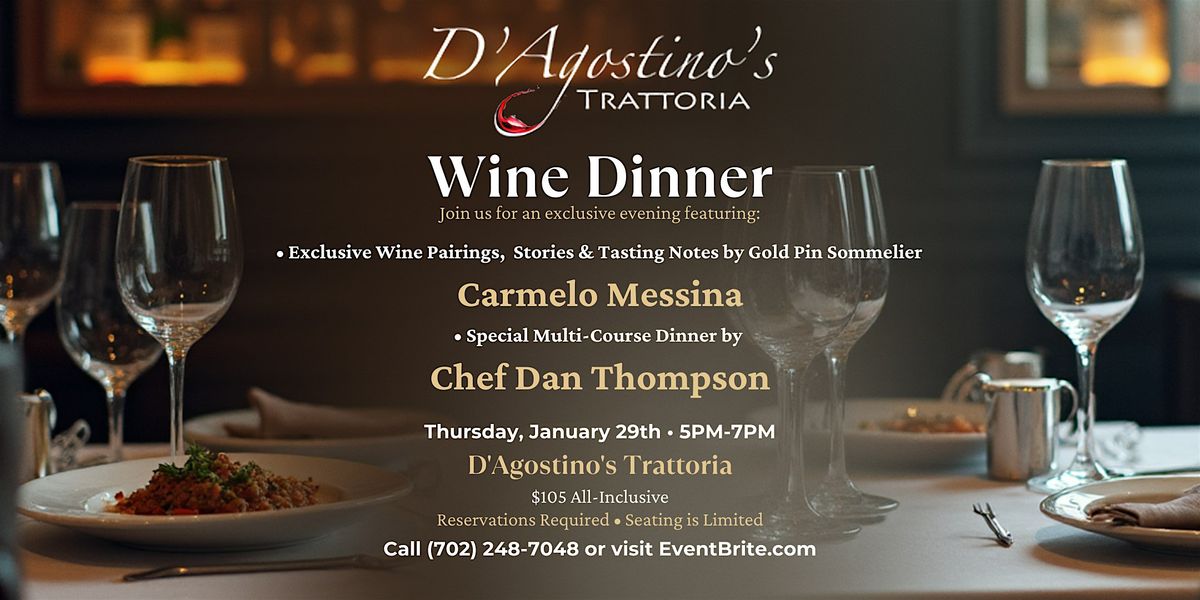 Join us for an exclusive evening at D'Agostino's Trattoria featuring a curated wine dinner hosted by the renowned Gold Pin Sommelier, CARMELO MESSINA. Experience delicious gourmet Italian dishes from D'Agostino's Owner/Exec. Chef, Dan Thompson, perfectly paired with exceptional wines, all in a relaxed and fun setting. Hear stories, discover new wines, discuss tasting notes, and more. Don't miss this unique chance to sip, savor, and learn from one of the best in the business!