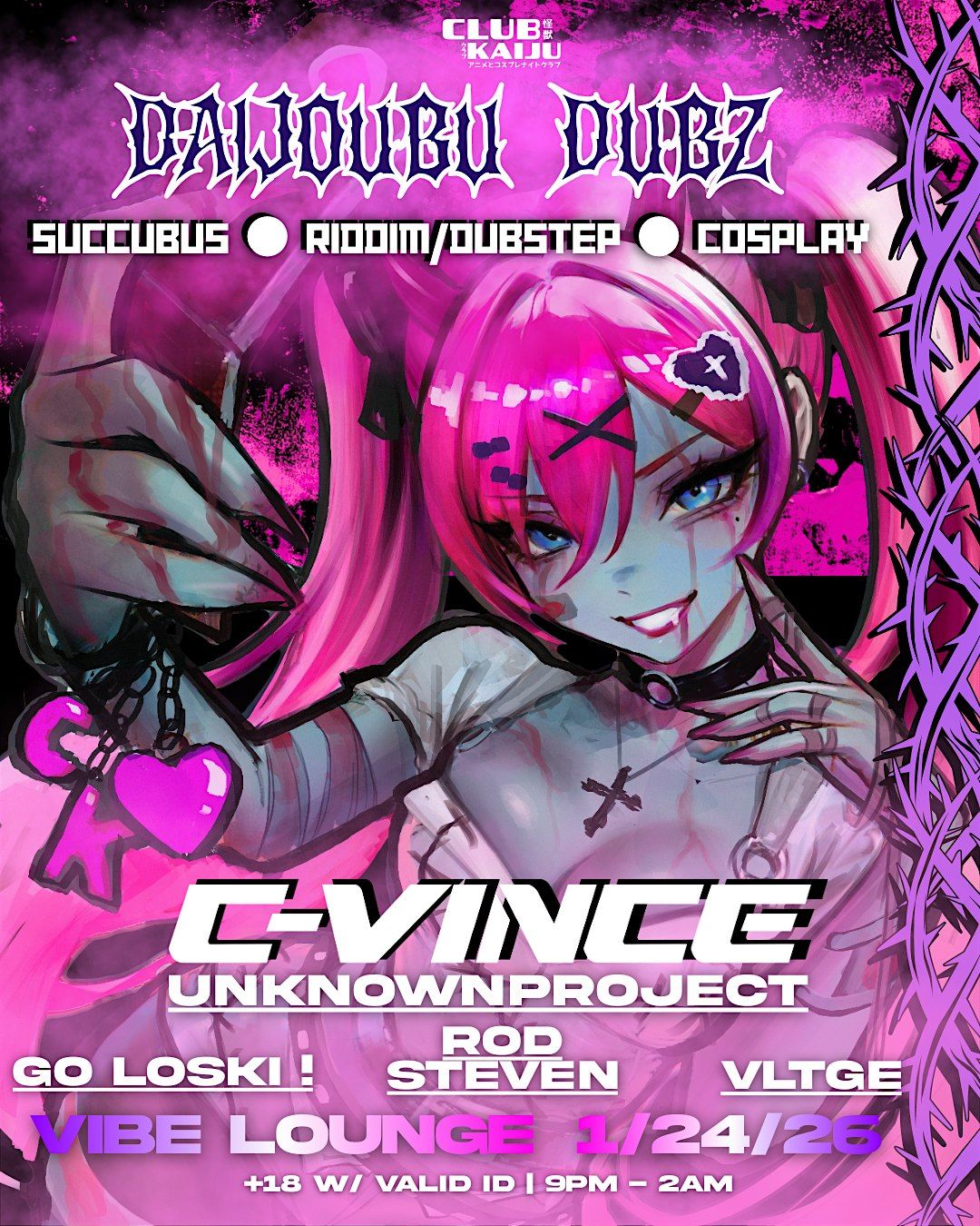 DaijoubuDubz is Club Kaiju's twisted, otherworldly, possessed and blighted side of its world. Filled with monstrous temptresses who desire nothing more than to tap into your deepest desires under a laser/bass filled night of wubz and waifus....