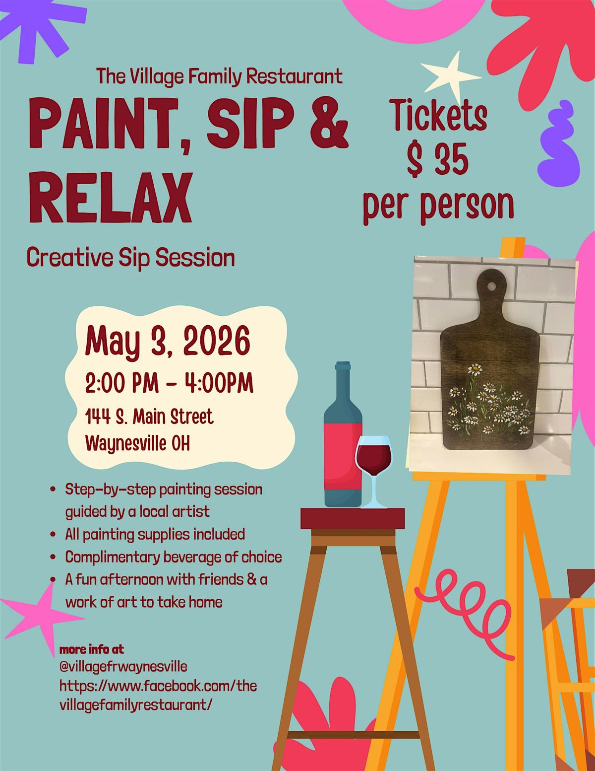 Looking for a fun afternoon out? Daisy Paint and Sip is the perfect way to unwind and get creative! Join us in person for an afternoon of painting, sipping your favorite drinks, and good vibes all around. No experience needed—just bring your smile and let your imagination flow. It's all about chilling, chatting, and creating something awesome. Don't miss out on this colorful night! In the past we have painted on Canvas, we are moving on to a wood cutting board! A lovely display for your home!