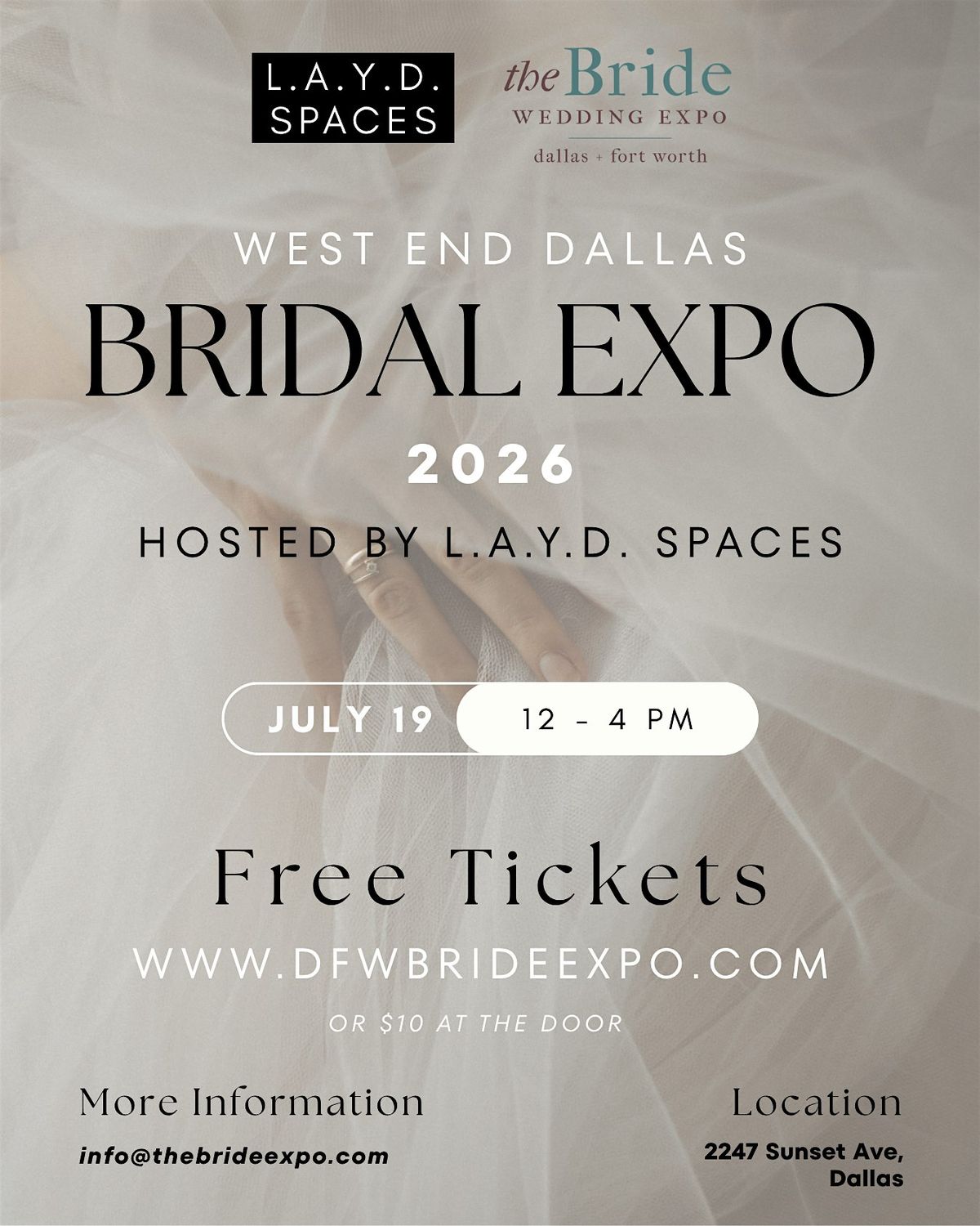 You're engaged β now what? Come spend the morning surrounded by everything you need to make your big day unforgettable at The Bride Expo: Dallas, happening July 19th at the stunning L.A.Y.D. Spaces event center in the West End District.