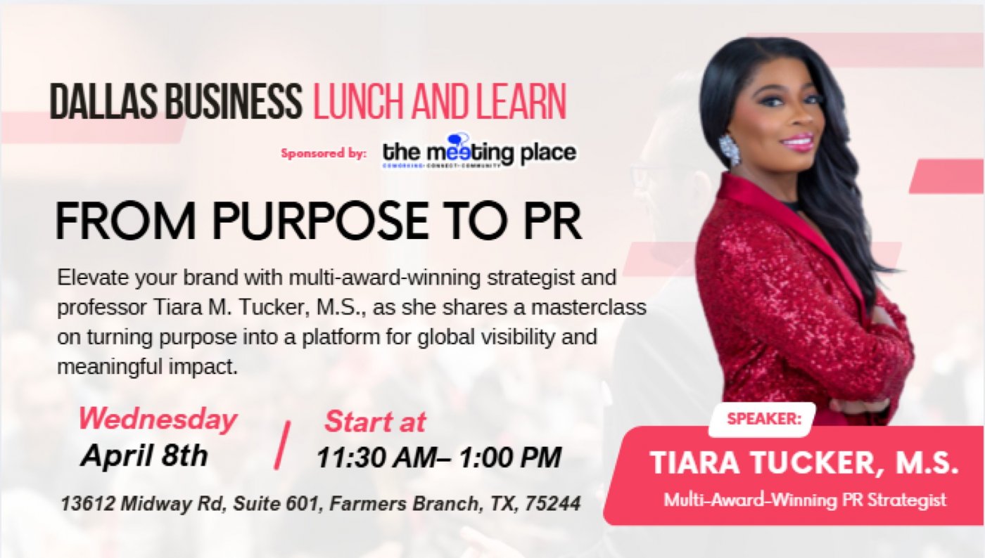 In this dynamic and empowering Lunch & Learn, multi-award-winning PR strategist, social impact leader, and college professor Tiara M. Tucker, M.S., shares how purpose-driven professionals can transform their vision into powerful brands that inspire visibility, credibility, and meaningful impact in their communities.