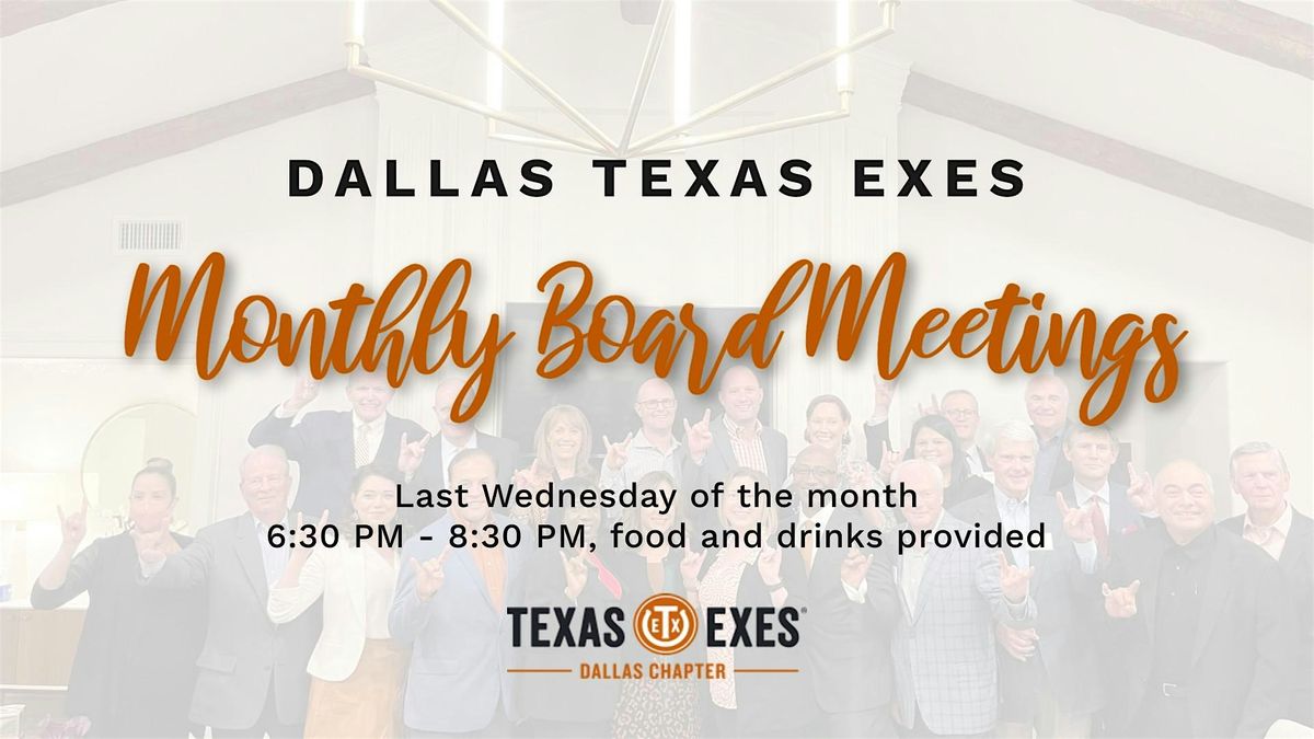 The Dallas Texas Exes meet every last Wednesday of the month (Except January, July and November. December is the FIRST Wednesday of the month) from 6:30 – 8:30 PM, in-person. Board meetings are open to all Texas Exes and friends. You do not need to be a paid Texas Exes member to volunteer with us or attend our events.