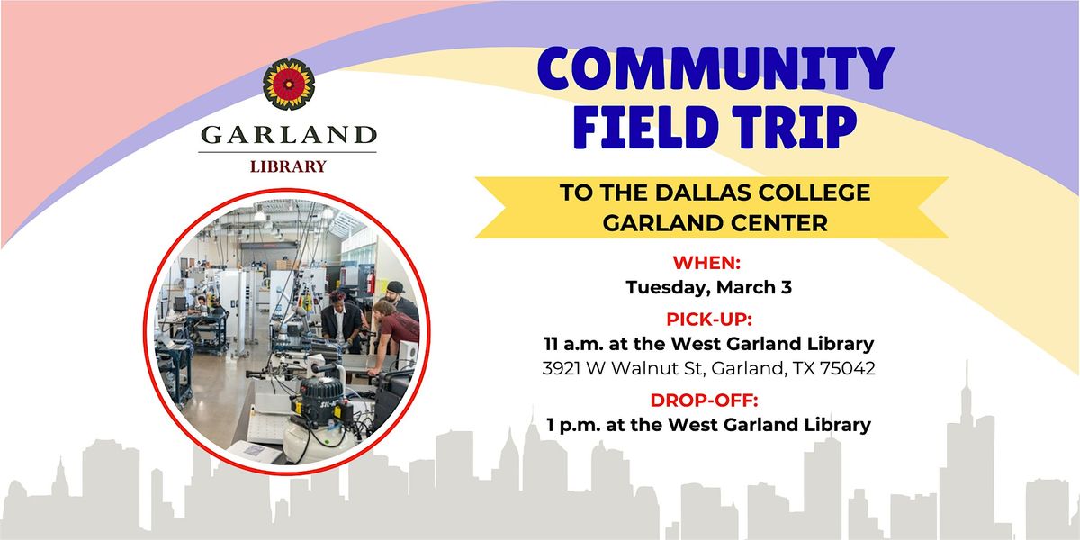 Discover Dallas College with ease! Garland Public Libraries invite you on a free field trip to tour the Dallas College Garland Center. Meet college staff, explore programs, and see how you can take the next step toward your education or career goals! Refreshments available while supplies last. Transportation from the West Garland Library provided by Garland Parks & Recreation.