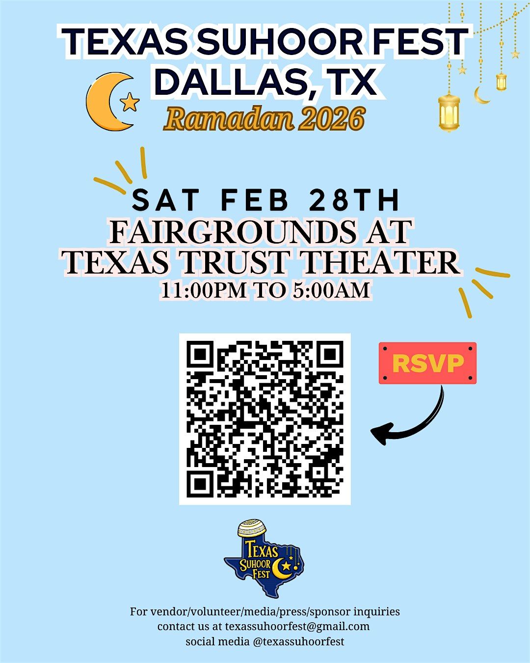 DALLAS, we're back!! The FOURTH annual Texas Suhoor Fest is here and better than ever! We're excited to bring y'all another memorable experience, the LARGEST suhoor fest in the nation! Experience the unparalleled charm of the Texas Suhoor Fest, a unique suhoor festival that brings together the finest halal cuisine from across the state of Texas. Immerse yourself in an enchanting night market filled with vibrant energy, where you can create lasting memories surrounded by fantastic vibes. Join us for a celebration of exceptional flavors and a one-of-a-kind suhoor experience!