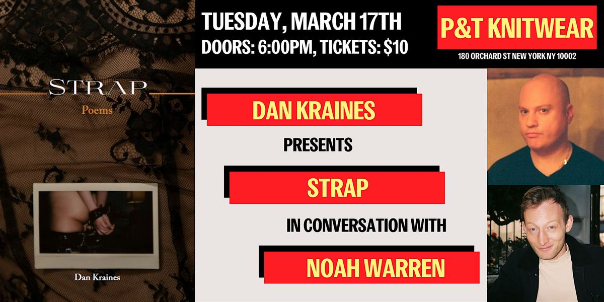 Dan Kraines is a queer poet of Viennese, Bolivian, and Ukrainian heritage. Strap is his first full-length book. He has published two chapbooks: Licht and Jaffa. Dan works at the writers’ residency Hawthornden Brooklyn on weekends and for the poet Sharon Olds during the week. He taught creative writing and creative nonfiction at the Fashion Institute of Technology and ELA at high schools for underserved students prior to his current work. Queer Longing, his PhD dissertation, won the Susan B. Anthony prize for gender and sexuality studies from the University of Rochester. He lives in an old tenement apartment on the Lower East Side.