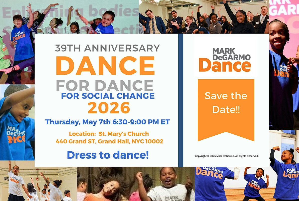 Dance for Dance for Social Change 2026 - 39th Anniversary includes a presentation, silent auction, live shout-out auction, dance lesson, and some 39th Anniversary surprises. The event will be back in person this year in the Lower East Side of Manhattan on May 7th!