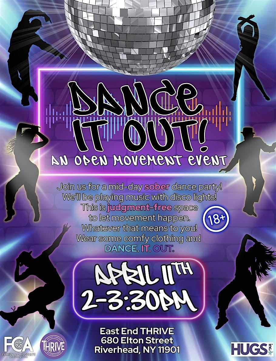 Dance It Out is a mid-day, recovery-friendly dance party at East End THRIVE. This is an open movement space with music and disco lights, created to be judgment-free and welcoming. Come as you are, move however you want, or take breaks as needed. Wear comfortable clothes and bring water if you’d like.