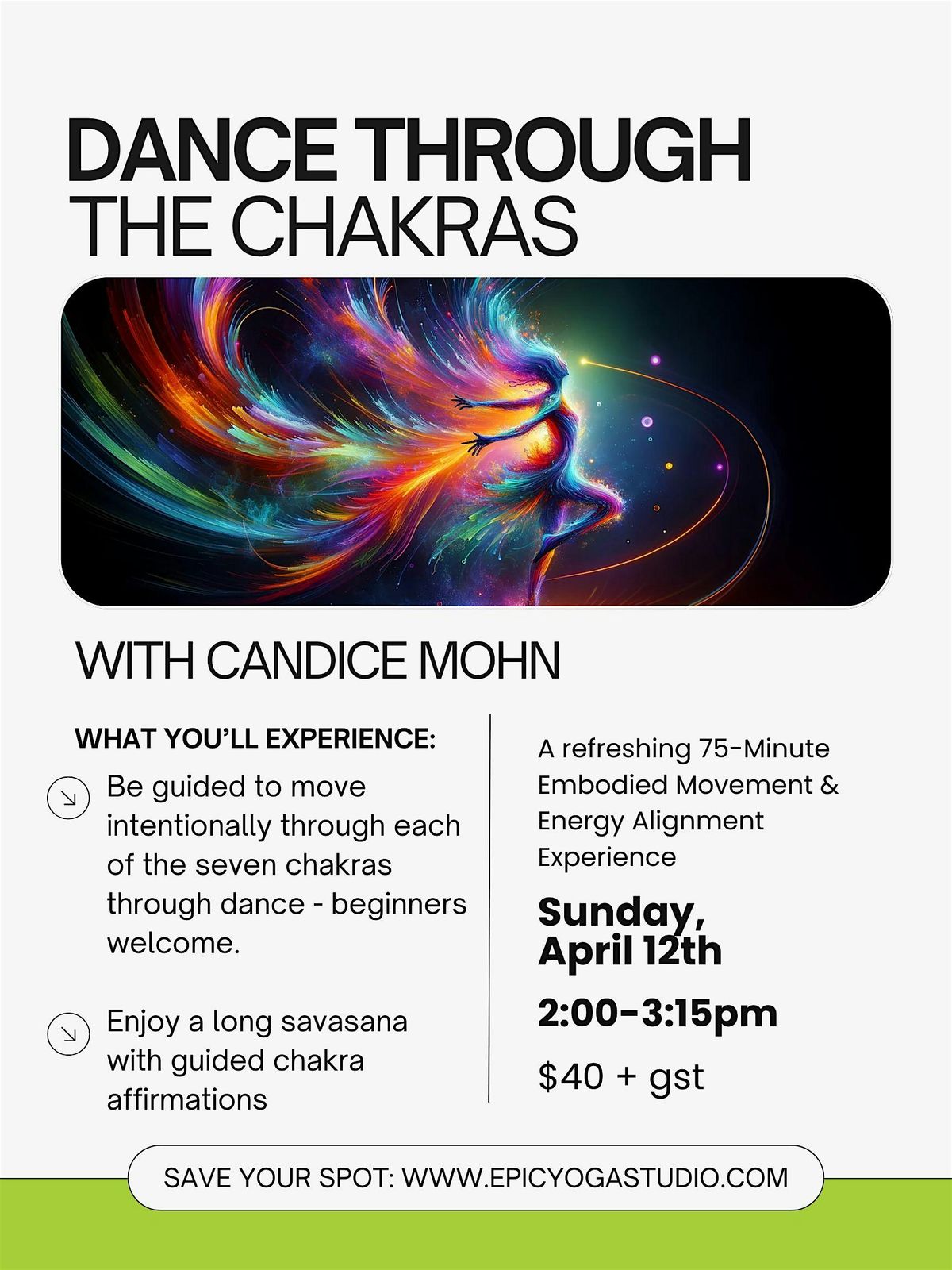 This experience concludes with a deeply nourishing Savasana where you will be guided through empowering chakra affirmations, allowing the benefits of your movement to integrate on an energetic level.