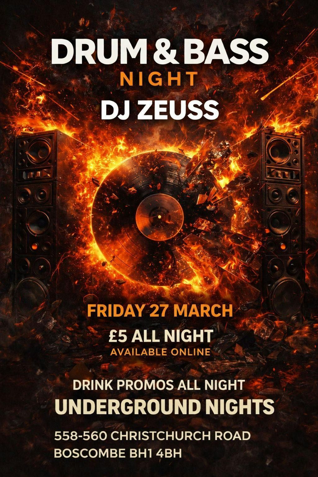 π₯ DRUM & BASS NIGHT β UNDERGROUND NIGHTS π₯Get ready for a heavy Drum & Bass takeover as DJ ZEUSS brings high-energy beats, deep basslines, and underground vibes all night long.