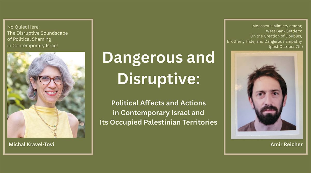 Join us for the final Israel Studies lecture of this academic year, "Dangerous and Disruptive Political Affects and Actions in Contemporary Israel and Its Occupied Palestinian Territories." Drawing on anthropological research with left-wing and right-wing Jewish Israeli activists, Profs. Michal Kravel-Tovi and Amir Reicher examine the production and consequences of political affect and action on Israel’s streets and in its settlements as activists grapple with (or manufacture) political crises and disruptions. Janet McIntosh will serve as discussant, and these talks will be followed be a panel Q&A.
