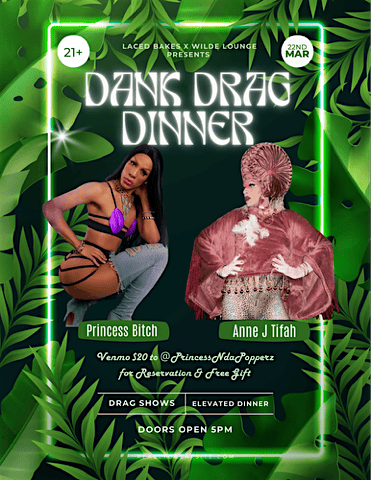 Join Princess B*tch and Anne J Tifah for another Dank Drag Dinner to remember! Food and Drinks spiked and infused with love to your liking and tolerance level.