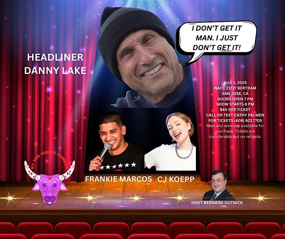 Come join us for an unforgettable night as Danny Lake takes the stage once again! This in person event will be held at 21727 Bertram Rd, San Jose, CA. Get ready for a night filled with incredible standup comedy by headliner Danny Lake with fantastic comedians Frankie Marcos and CJ Koepp. Don't miss out on this opportunity to see Danny Lake perform live! Mark your calendars and invite your friends for a night you won't forget.