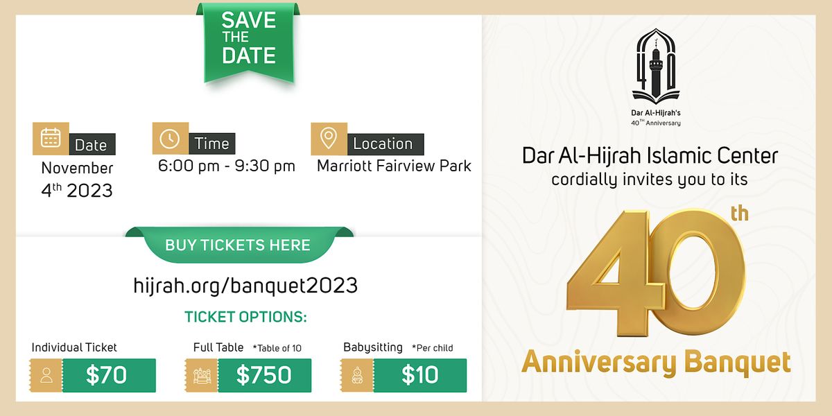 You are cordially invited to Dar Al-Hijrah's 40th Anniversary Fundraising Banquet DinnerAbout this Event