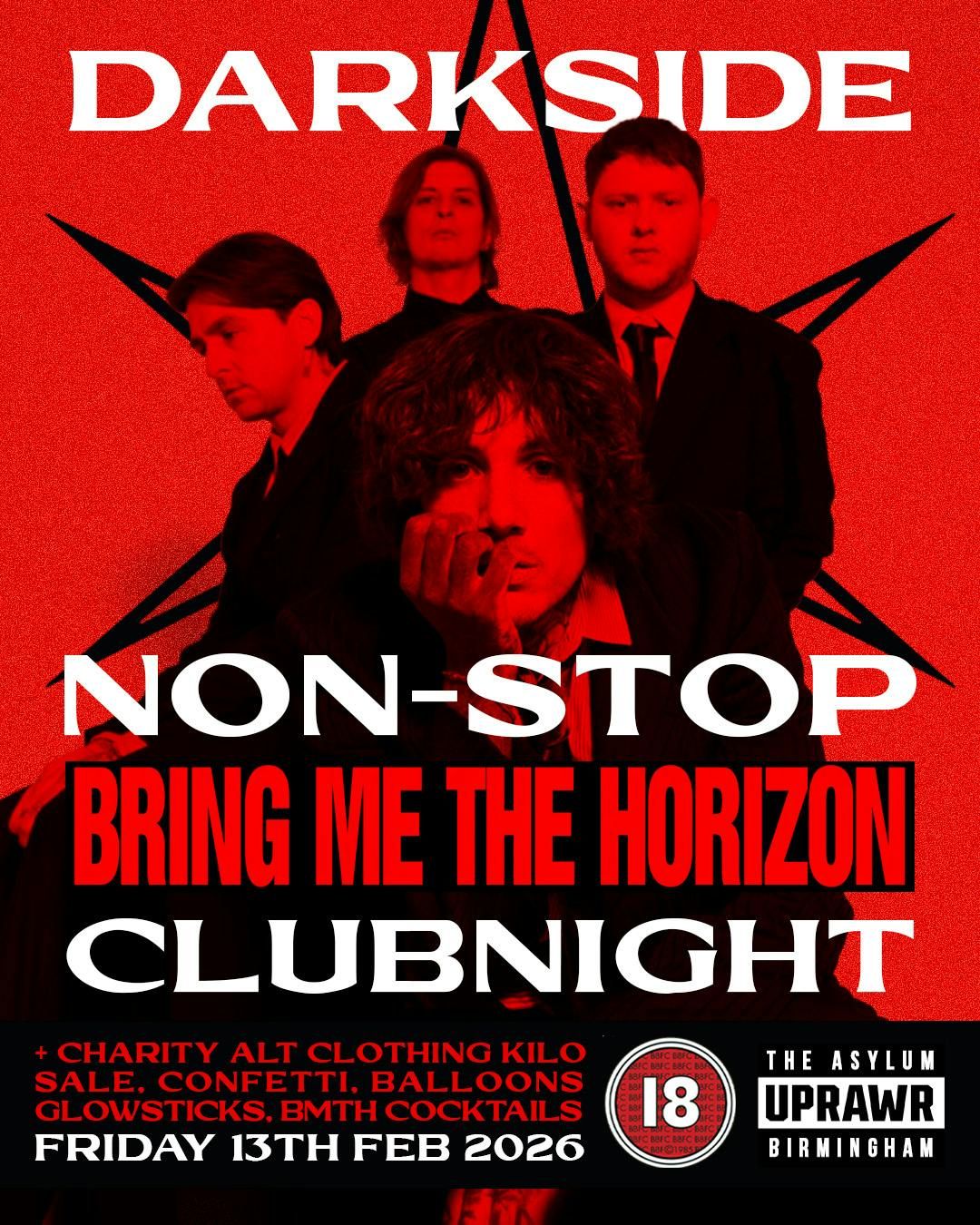 DARKSIDE: A night of NON-STOP Bring Me The Horizon.For the first time ever, we are opening up on a Friday night to deliver a night of back to back, uninterrupted Bring Me The Horizon, playing songs from Count Your Blessings straight through to Nex Gen. 3 and a half hours of PURE non-stop BMTH tunes from every single era! Note that we will ALSO be open on the Saturday night for our Galentines Valentines clubnight <3 Charity Kilo Sale featuring Exclusive Bring Me The Horizon merchandise! In addition we will be opening up our upstairs room from 12.30 until close to host our second charity kilo sale raising funds for the UPRAWR Mental Health Foundation. Here you will be able to get exclusive and brand new unused merchanise from Bring Me The Horizon, Bury Tomorrow, Deaf Havana, Nothing But Thieves, Slam Dunk Festival, Fontaines DC and more. All profits from this go towards providing free mental health counselling services PLUS you can put your purchases in the cloakroom until the end of the clubnight free of charge! Find out more about our charity at www.uprawrfoundation.orgPlus★ Cheap Drinks★ Confetti★ Exclusive BMTH themed Cocktails★ LED Battens★ Photo Booth★ Signature Blood Bag Cocktails★ Angel Wings and Devil Horns Photo Ops★ Safe Space★ PhotographerGot an upcoming birthday / stag do / hen do and want to hire the VIP podiums? Email [email protected] FREE ENTRYDM us on social media to learn how to get free entry for your birthday!Disclaimer: