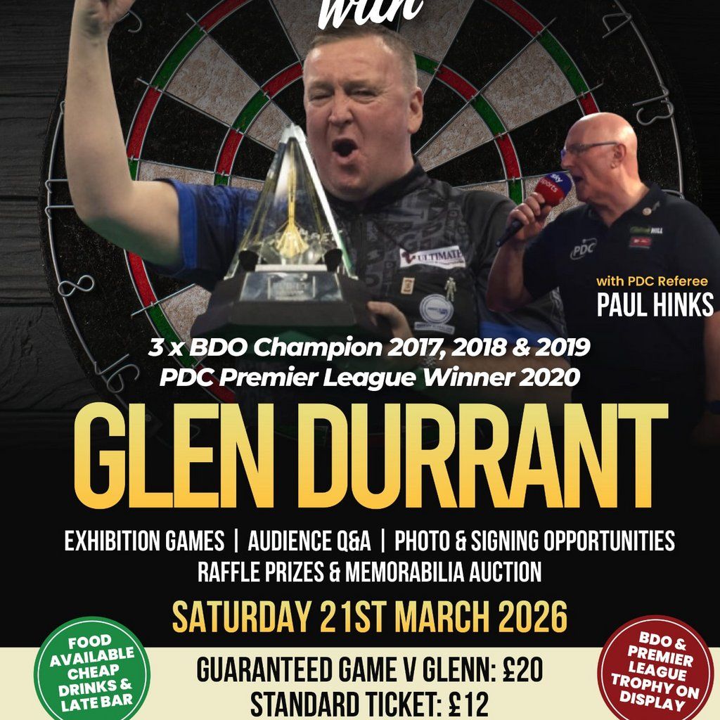 Darts exhibition with former PDC Premier League champion and multi BDO winner Glen Durrant,a night of fun, darts, music and laughter