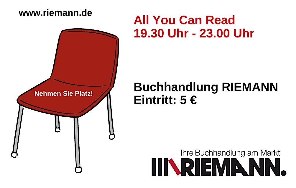 Wer Lust hat, die "Riemann'sche" einmal ganz anders zu erleben, wird unser "All You Can Read" lieben: Von 19.30 Uhr bis 23.00 Uhr können Sie nach Herzenslust stöbern und schmökern, ganz ohne Zeitdruck und Alltagshektik.