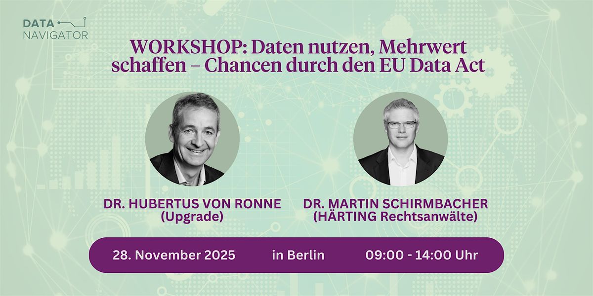 Der kompakte Präsenzworkshop am 28. November 2025 in Berlin richtet sich an Fach- und Führungskräfte, die die neuen Möglichkeiten zur Datennutzung durch den EU Data Act praxisnah und rechtssicher erschließen möchten.