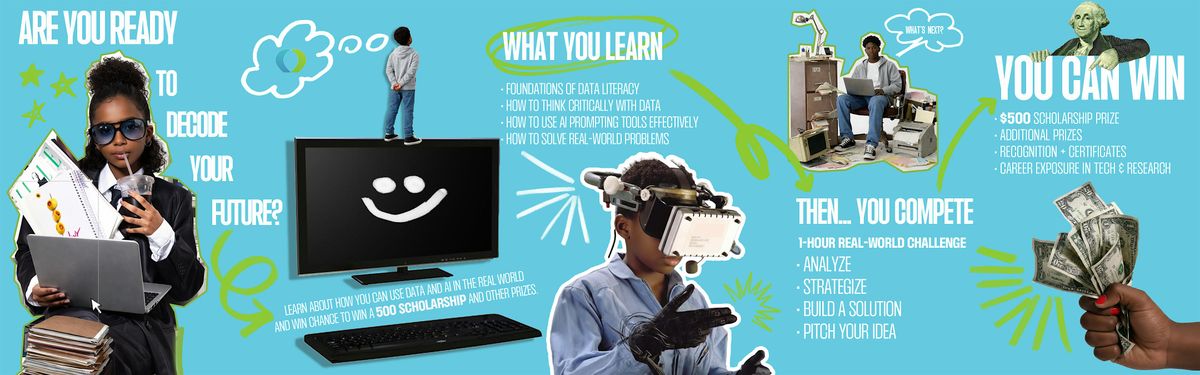 Data to Power: Youth Innovation Challenge & Black Futures Career Panel is a full-day event designed to equip Black youth (ages 13β19) with the tools, skills, and mentorship needed to thrive in the age of technology. Participants will learn the foundations of data literacy, explore AI prompting, apply their skills to solve a real-world problem, and present their ideas for a chance to win a $500 scholarship and additional prizes.