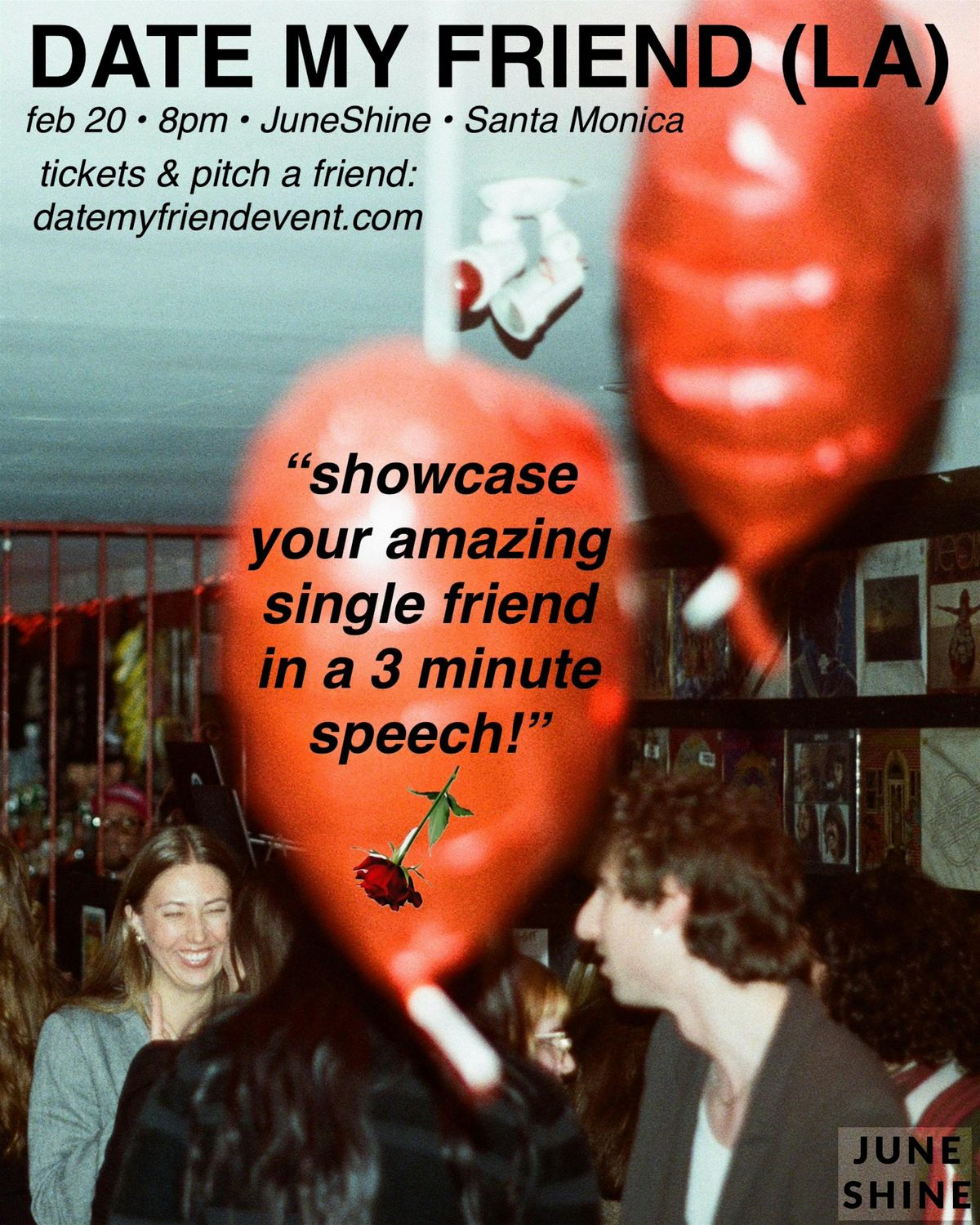 Date My Friend (LA) aims to bring people together offline. Hosted by two close friends who represent the entire dating spectrum, they’re on a mission to give everyone a story when someone asks, “how’d you meet?" Watch people hop on stage & introduce the audience to their amazing single friend. We’ll hear about how they met, what makes them tick, and try to understand why they’re still single. After the last pitch, our resident DJ will provide a soundtrack while everyone mingles. Go analog, bring your pals, and hang.