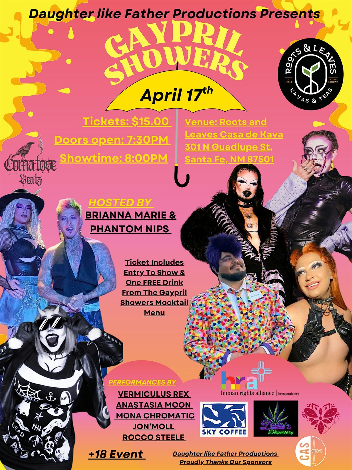April showers bring Gaypril Showers! Join us on April 17th for a night of drag, music, and community featuring talented New Mexico drag artists and a live DJ. Expect showers of glitter, unforgettable performances, and a high enery atmosphere all night long.