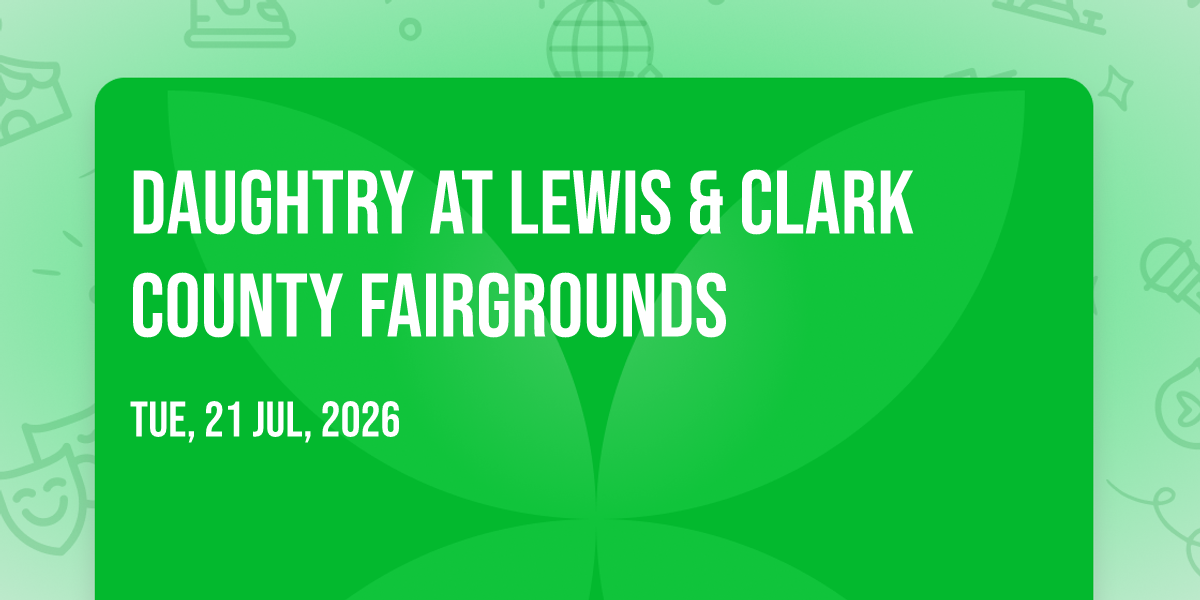 🎉 Welcome to Daughtry at Lewis & Clark County Fairgrounds, where the impossible becomes possible and dreams take flight! 🏛️ Join us at Lewis & Clark County Fairgrounds in the heart of Helena, MT for an event that will redefine your expectations. 📅 On July 21st, 2026 at 07:30 PM, witness the transformation of space and time into something truly magical. ✨ It's a curated experience combining the best of innovation, entertainment, and community spirit, creating moments that will be remembered for years to come. Whether you're a first-time visitor or a seasoned enthusiast, prepare to be amazed. 🎊 Book now to ensure your place in this unforgettable experience!