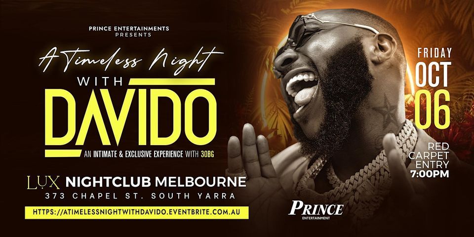 Davido in Melbourne. Get ready for an exclusive unforgettable night at Lux Nightclub Melbourne as international superstar Davido serenades guests.PRINCE ENTERTAINMENT & BLVK DYNASTY AUSTRALIA PRESENT: