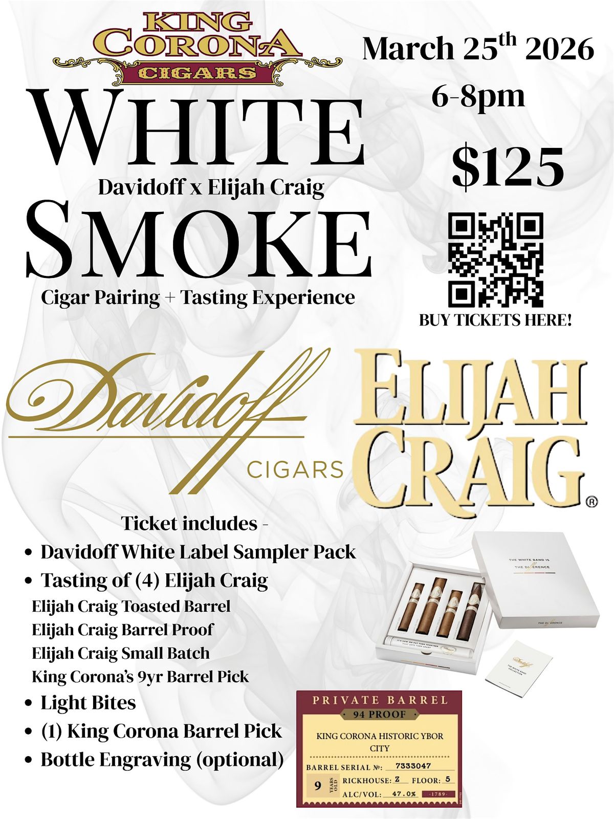 Get ready for an unforgettable in-person event where smooth vibes meet rich flavors! Dive into the world of Davidoff cigars and Elijah Craig bourbon in the ultimate WHITE SMOKE Experience. It's all about great smokes, bold sips, and good times with friends. Don’t miss out on this chance to taste, chill, and enjoy an epic combo of luxury and flavor. See you there!