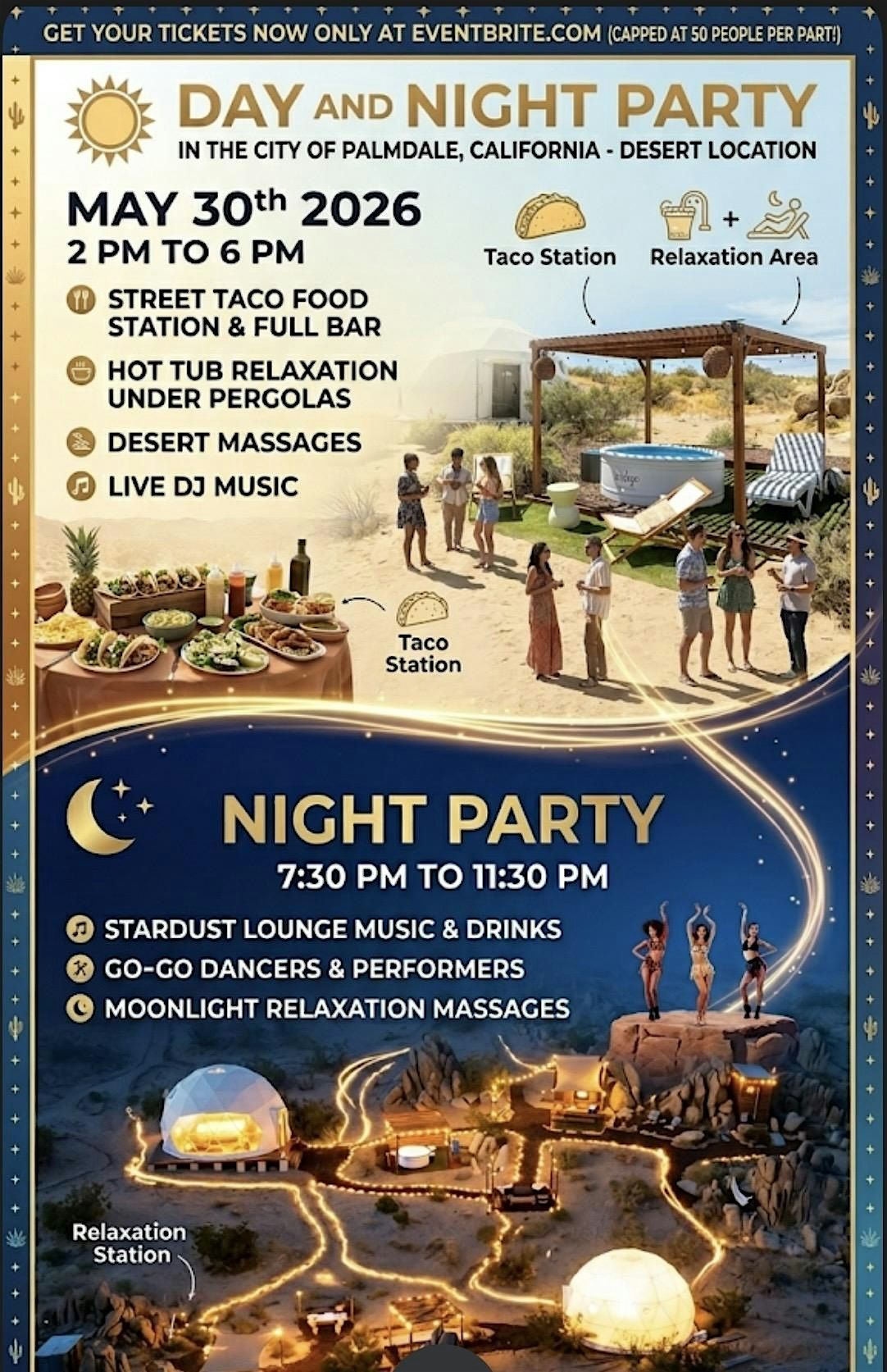 DAY AND NIGHT PARTY $30 PER PERSON 2 TICKET MAX AT $50 ( 50 PEOPLE CAP PER PARTY ) FROM 2 PM TO 6 PM AND 7:30 PM TO 11:30 VIP $50 TO $80