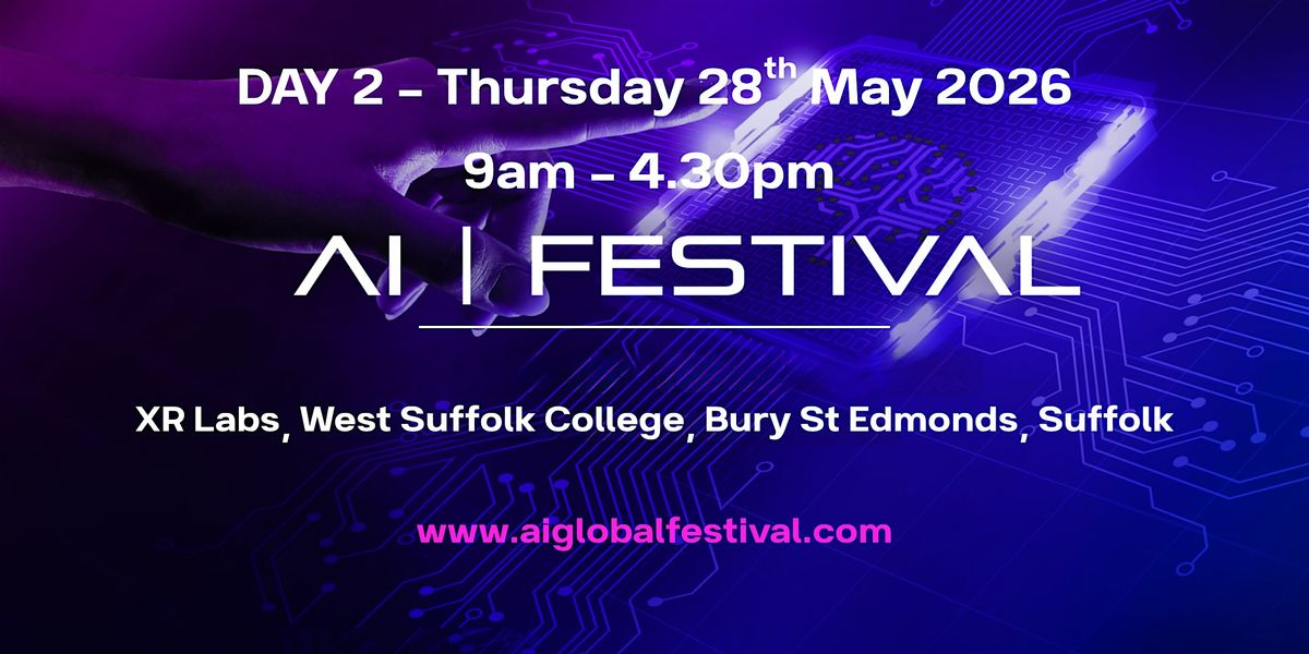 Welcome to DAY TWO (28th May 2026) of the AI Festival 2026 happening at the award winning XR Labs, West Suffolk College between May 27th-28th, 2026 at 9:00 AM β 4.30 PM (Europe/London time)! π