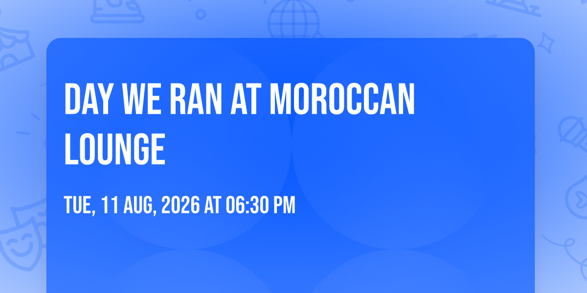 π Welcome to Day We Ran at Moroccan Lounge, where dreams come alive and possibilities are endless! ποΈ Join us at Moroccan Lounge in the heart of Los Angeles, CA for an event that defies expectations. π On August 11th, 2026 at 06:30 PM, be part of something truly extraordinary as we bring together innovation, entertainment, and pure magic. β¨ Every aspect has been carefully designed to ensure an unforgettable experience for all our guests. Whether you're seeking adventure, inspiration, or simply a break from the ordinary, this event promises to deliver beyond your wildest dreams. π Prepare for a journey into the extraordinary!