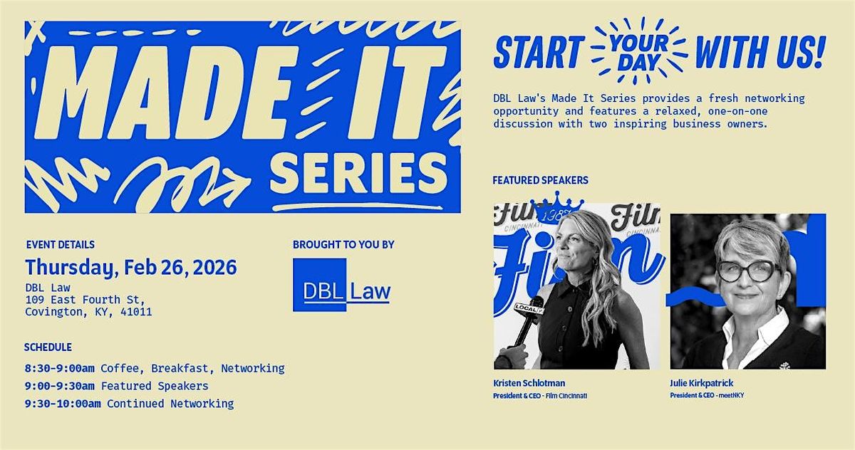 Join us on Thursday, February 26 for the return of DBL Law’s Made It Series, featuring two remarkable regional leaders. Grab a cup of coffee and enjoy an engaging conversation with Kristen Schlotman, President & CEO of Film Cincinnati, and Julie Kirkpatrick, President & CEO of meetNKY.